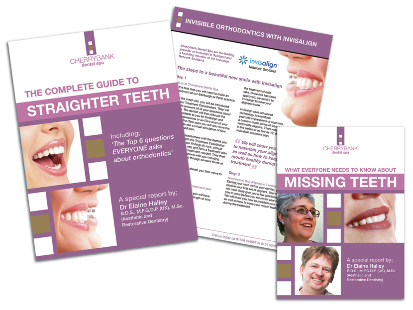 Cherrybank Dental Spa offer the ultimate treatments in the most luxurious way. They asked me to design two brochure guides about Straighter teeth and Missing teeth. These brochures are downloadable on their website; www.cherrybankdentalspa.co.uk