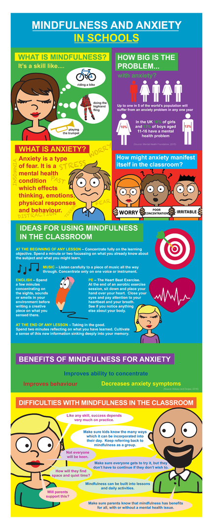 This infographic was designed for schools who were teaching high school children about Mindfulness and anxiety. This was designed to give them a better understanding of what anxiety is, that it is not something to be ashamed of, and that mindfulness can help people to cope with it.