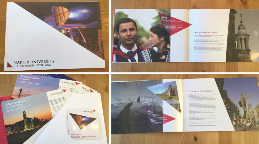 design on high quality materials to give to potential students from oversees. The design was to be based on their new logo. I used the triangle in the logo to inspire the shapes on each