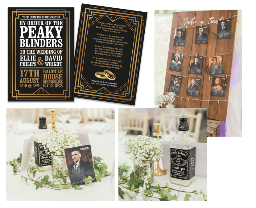 When I was asked to design an invite, bottle labels and table planner for a Peaky Blinders wedding I was delighted! This wedding was absolutely amazing. When I saw pictures of the big day you would think they had gone back in time. Every detail had been thought of and every guest was dressed for the era - amazing! I decided to design an art deco style invite to fit in with the theme and timeline of Peaky Blinders. The table settings are character based with a merge into the Peaky Blinders main street.
