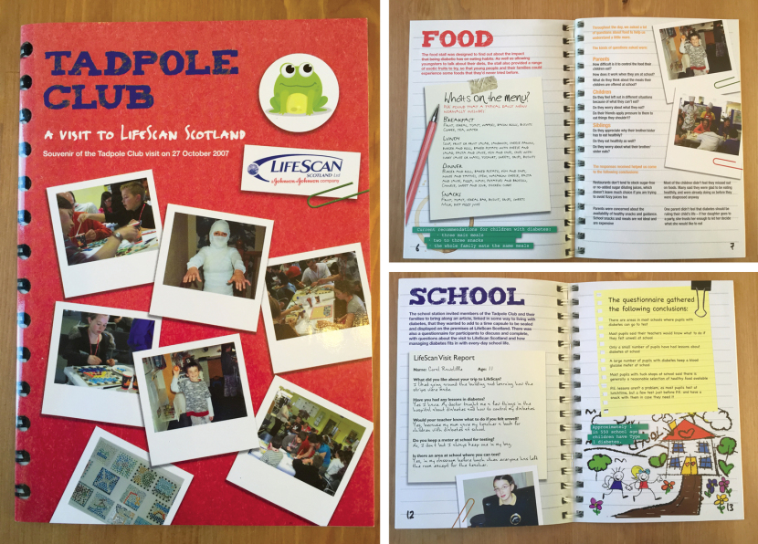 Lifescan Scotland is a Johnson and Johnson company that works with people with Diabetes. This was designed as a momento brochure after a special event. Because it was aimed at children I made it a fun book that looked like it had been put together as a scrap book.