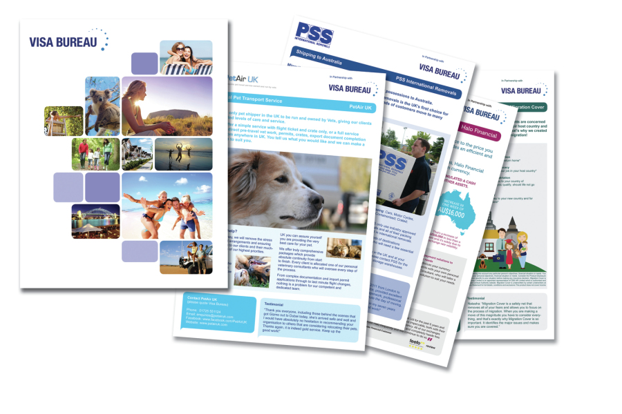 Visa Bureau are an emmigration company who help people to get their visas for New Zealand and Australia. They needed an attractive folder with information leaflets to hand out to potential clients at the many events and exhibitions they attend. Working with Visa Bureau and their partners to gather all the information I designed an eye catching folder and inserts for them.